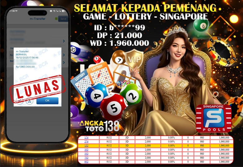 Baru aja terjadi kejadian luar biasa di ANGKATOTO138. Member b99 hanya deposit 21.000 di game LOTTERY SINGAPORE POOLS , berhasil bawa pulang Rp 1.960.000 ๐. Proses WD cepat dan mulus tanpa hambatan. #ANGKATOTO138