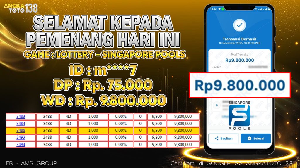 Baru aja terjadi kejadian luar biasa di ANGKATOTO138. Member m****7 hanya deposit 75.000 di game SINGAPORE POOLS , berhasil bawa pulang Rp 9.800.000 ๐Ÿš€. Proses WD cepat dan mulus tanpa hambatan. #ANGKATOTO138