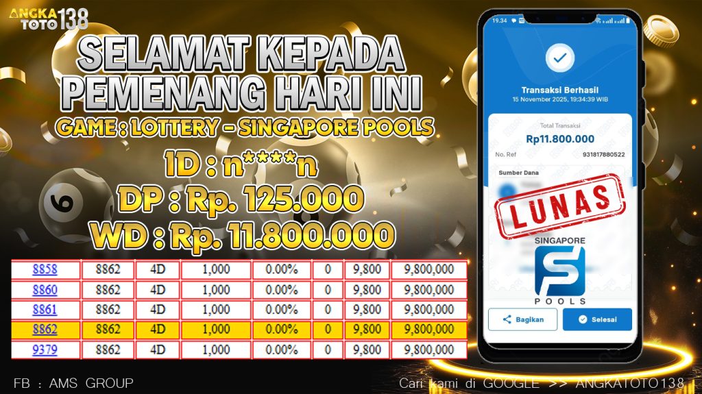 Baru aja terjadi kejadian luar biasa di ANGKATOTO138. Member n****n hanya deposit 125.000 di game SINGAPORE POOLS , berhasil bawa pulang Rp 11.800.000 ๐. Proses WD cepat dan mulus tanpa hambatan. #ANGKATOTO138