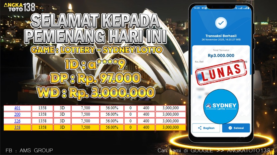 Baru aja terjadi kejadian luar biasa di ANGKATOTO138. Member a****9 hanya deposit 97.000 di game SYDNEY LOTTO , berhasil bawa pulang Rp 3.000.000 ๐Ÿš€. Proses WD cepat dan mulus tanpa hambatan. #ANGKATOTO138