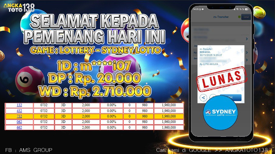 Baru aja terjadi kejadian luar biasa di ANGKATOTO138. Member m****i07 hanya deposit 20.000 di game LOTTERY SYDNEY LOTTO , berhasil bawa pulang Rp 2.710.000 ๐. Proses WD cepat dan mulus tanpa hambatan. #ANGKATOTO138
