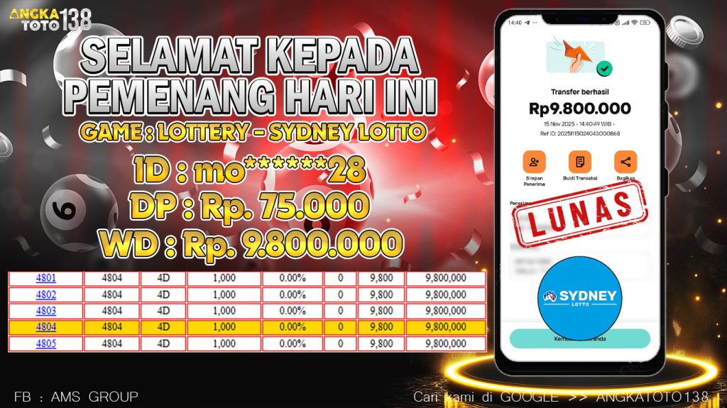 Baru aja terjadi kejadian luar biasa di ANGKATOTO138. Member mo28 hanya deposit 75.000 di game SYDNEY LOTTO , berhasil bawa pulang Rp 9.800.000 ๐. Proses WD cepat dan mulus tanpa hambatan. #ANGKATOTO138