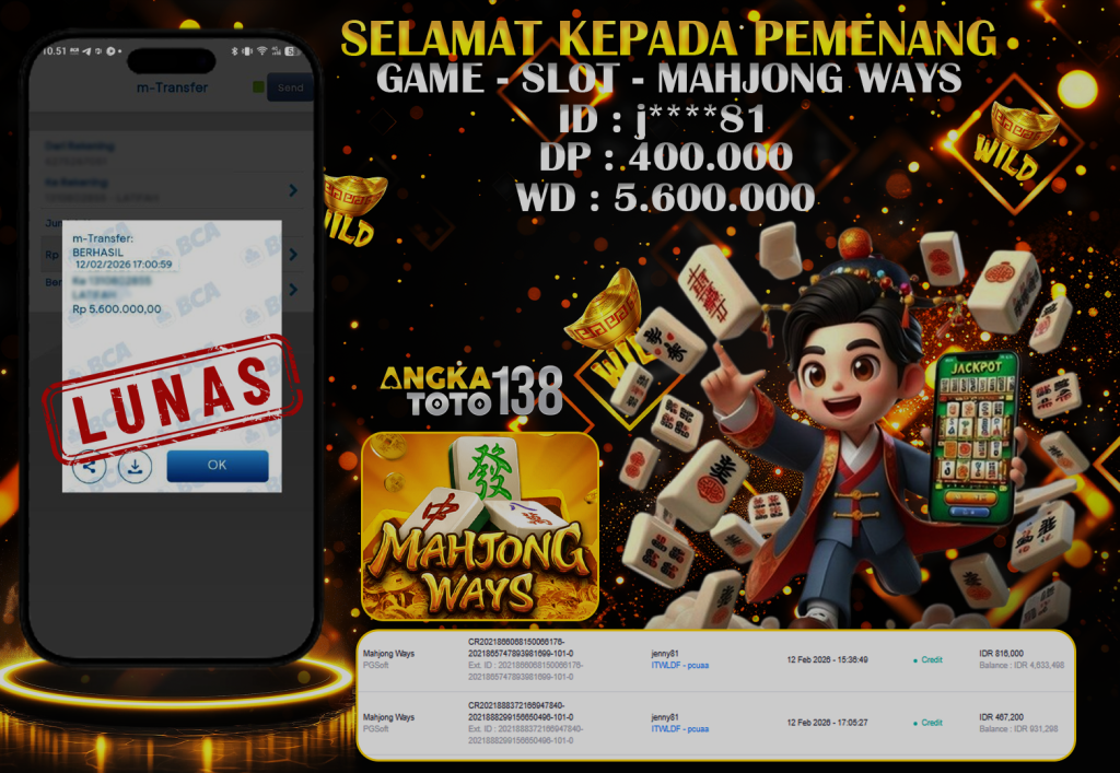 Baru aja terjadi kejadian luar biasa di ANGKATOTO138. Member j****81 hanya deposit 400.000 di game MAHKONG WAYS , berhasil bawa pulang Rp 5.600.000 ๐Ÿš€. Proses WD cepat dan mulus tanpa hambatan. #ANGKATOTO138