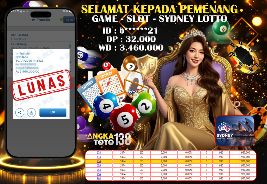 Baru aja terjadi kejadian luar biasa di ANGKATOTO138. Member b21 hanya deposit 32.000 di game SYDNEY LOTTO , berhasil bawa pulang Rp 3.460.000 ๐Ÿš€. Proses WD cepat dan mulus tanpa hambatan. #ANGKATOTO138