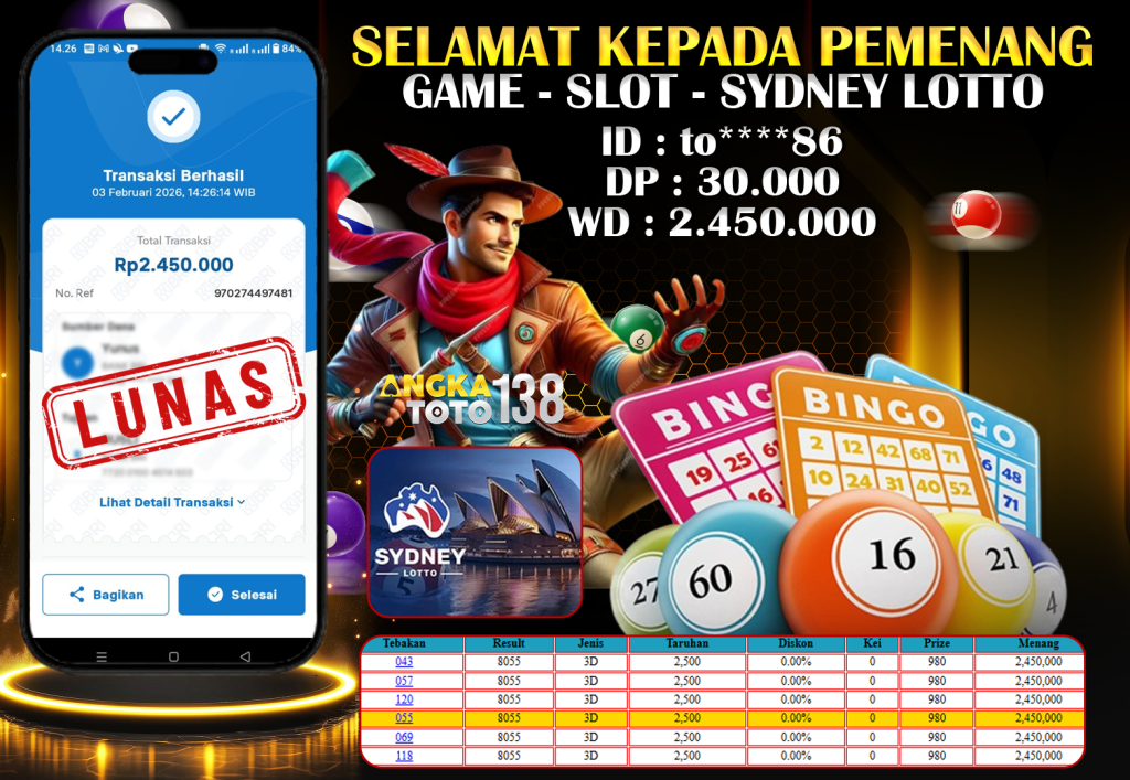 Baru aja terjadi kejadian luar biasa di ANGKATOTO138. Member to****86 hanya deposit 30.000 di game SYDNEY LOTTO, berhasil bawa pulang Rp 2.450.000 ๐. Proses WD cepat dan mulus tanpa hambatan. #ANGKATOTO138